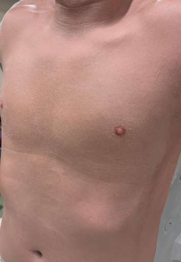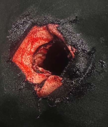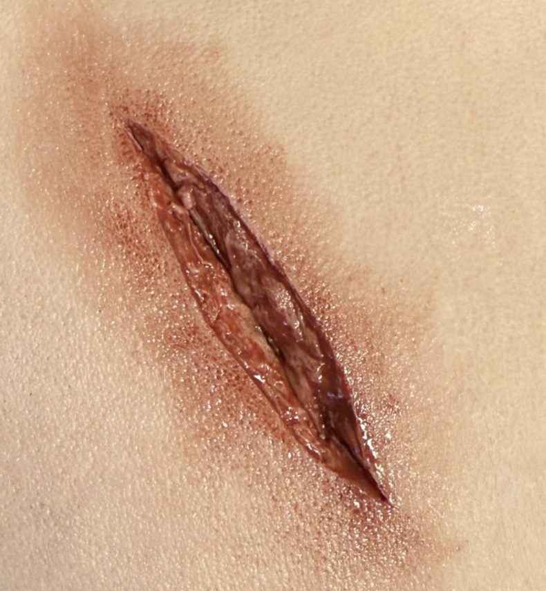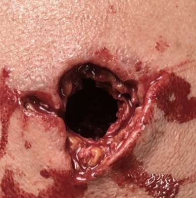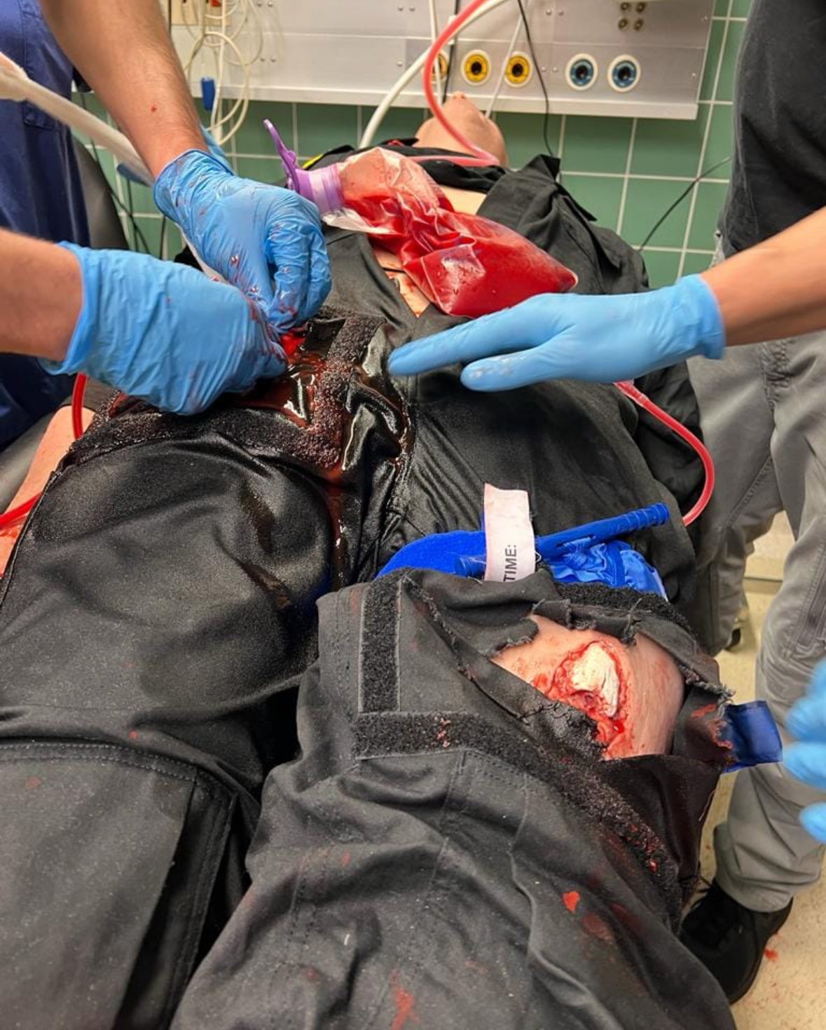 - Gunshot wound on right groin for wound-packing/tamponade training, including plastic bottle and connection hose for external blood source.