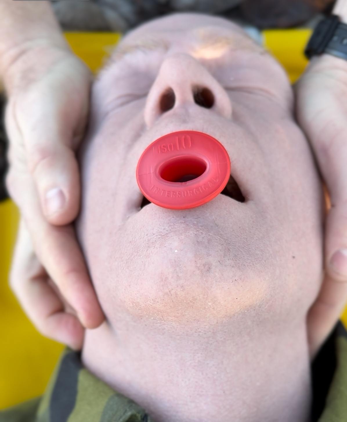 The PRO Elite is additionally equipped with an airway for field-based training scenarios that include airway management. It is possible to secure the airway using anything from a nasal airway (nasopharyngeal airway) or oropharyngeal airway, to an i-gel/laryngeal mask or intubation.