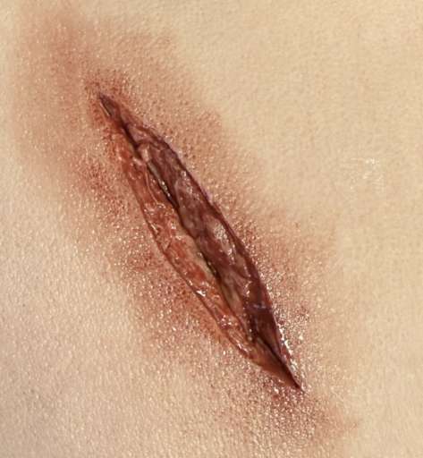 - Laceration on left upper arm for training in manual pressure/pressure bandage/tourniquet, including plastic bottle and connection hose for external blood source.